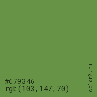 Цвет #679346 в цветовой модели RGB обозначается тремя октетами (103, 147, 70) в десятичном формате и #679346 в шестнадцатиричном (hex) формате, которые являются интенсивностью красного 103 (hex 67), интенсивность зелёного 147 (hex 93) и интенсивность синего 70 (hex 46).