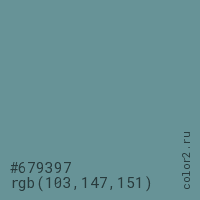 Цвет #679397 в цветовой модели RGB обозначается тремя октетами (103, 147, 151) в десятичном формате и #679397 в шестнадцатиричном (hex) формате, которые являются интенсивностью красного 103 (hex 67), интенсивность зелёного 147 (hex 93) и интенсивность синего 151 (hex 97).