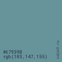 Цвет #67939B в цветовой модели RGB обозначается тремя октетами (103, 147, 155) в десятичном формате и #67939B в шестнадцатиричном (hex) формате, которые являются интенсивностью красного 103 (hex 67), интенсивность зелёного 147 (hex 93) и интенсивность синего 155 (hex 9B).