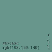 Цвет #67968C в цветовой модели RGB обозначается тремя октетами (103, 150, 140) в десятичном формате и #67968C в шестнадцатиричном (hex) формате, которые являются интенсивностью красного 103 (hex 67), интенсивность зелёного 150 (hex 96) и интенсивность синего 140 (hex 8C).