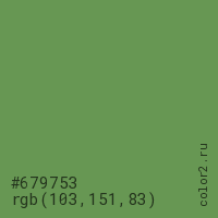 Цвет #679753 в цветовой модели RGB обозначается тремя октетами (103, 151, 83) в десятичном формате и #679753 в шестнадцатиричном (hex) формате, которые являются интенсивностью красного 103 (hex 67), интенсивность зелёного 151 (hex 97) и интенсивность синего 83 (hex 53).