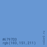 Цвет #6797D3 в цветовой модели RGB обозначается тремя октетами (103, 151, 211) в десятичном формате и #6797D3 в шестнадцатиричном (hex) формате, которые являются интенсивностью красного 103 (hex 67), интенсивность зелёного 151 (hex 97) и интенсивность синего 211 (hex D3).