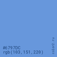 Цвет #6797DC в цветовой модели RGB обозначается тремя октетами (103, 151, 220) в десятичном формате и #6797DC в шестнадцатиричном (hex) формате, которые являются интенсивностью красного 103 (hex 67), интенсивность зелёного 151 (hex 97) и интенсивность синего 220 (hex DC).