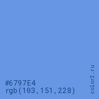 Цвет #6797E4 в цветовой модели RGB обозначается тремя октетами (103, 151, 228) в десятичном формате и #6797E4 в шестнадцатиричном (hex) формате, которые являются интенсивностью красного 103 (hex 67), интенсивность зелёного 151 (hex 97) и интенсивность синего 228 (hex E4).