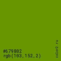 Цвет #679802 в цветовой модели RGB обозначается тремя октетами (103, 152, 2) в десятичном формате и #679802 в шестнадцатиричном (hex) формате, которые являются интенсивностью красного 103 (hex 67), интенсивность зелёного 152 (hex 98) и интенсивность синего 2 (hex 02).