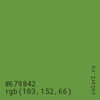 Цвет #679842 в цветовой модели RGB обозначается тремя октетами (103, 152, 66) в десятичном формате и #679842 в шестнадцатиричном (hex) формате, которые являются интенсивностью красного 103 (hex 67), интенсивность зелёного 152 (hex 98) и интенсивность синего 66 (hex 42).