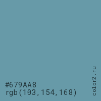 Цвет #679AA8 в цветовой модели RGB обозначается тремя октетами (103, 154, 168) в десятичном формате и #679AA8 в шестнадцатиричном (hex) формате, которые являются интенсивностью красного 103 (hex 67), интенсивность зелёного 154 (hex 9A) и интенсивность синего 168 (hex A8).