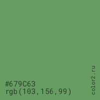 Цвет #679C63 в цветовой модели RGB обозначается тремя октетами (103, 156, 99) в десятичном формате и #679C63 в шестнадцатиричном (hex) формате, которые являются интенсивностью красного 103 (hex 67), интенсивность зелёного 156 (hex 9C) и интенсивность синего 99 (hex 63).