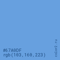 Цвет #67A0DF в цветовой модели RGB обозначается тремя октетами (103, 160, 223) в десятичном формате и #67A0DF в шестнадцатиричном (hex) формате, которые являются интенсивностью красного 103 (hex 67), интенсивность зелёного 160 (hex A0) и интенсивность синего 223 (hex DF).