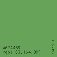 Цвет #67A459 в цветовой модели RGB обозначается тремя октетами (103, 164, 89) в десятичном формате и #67A459 в шестнадцатиричном (hex) формате, которые являются интенсивностью красного 103 (hex 67), интенсивность зелёного 164 (hex A4) и интенсивность синего 89 (hex 59).