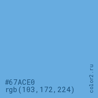 Цвет #67ACE0 в цветовой модели RGB обозначается тремя октетами (103, 172, 224) в десятичном формате и #67ACE0 в шестнадцатиричном (hex) формате, которые являются интенсивностью красного 103 (hex 67), интенсивность зелёного 172 (hex AC) и интенсивность синего 224 (hex E0).