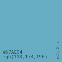 Цвет #67AEC4 в цветовой модели RGB обозначается тремя октетами (103, 174, 196) в десятичном формате и #67AEC4 в шестнадцатиричном (hex) формате, которые являются интенсивностью красного 103 (hex 67), интенсивность зелёного 174 (hex AE) и интенсивность синего 196 (hex C4).