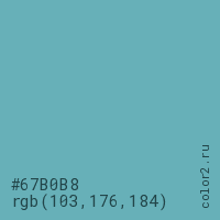 Цвет #67B0B8 в цветовой модели RGB обозначается тремя октетами (103, 176, 184) в десятичном формате и #67B0B8 в шестнадцатиричном (hex) формате, которые являются интенсивностью красного 103 (hex 67), интенсивность зелёного 176 (hex B0) и интенсивность синего 184 (hex B8).