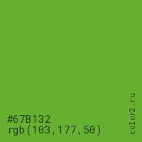 Цвет #67B132 в цветовой модели RGB обозначается тремя октетами (103, 177, 50) в десятичном формате и #67B132 в шестнадцатиричном (hex) формате, которые являются интенсивностью красного 103 (hex 67), интенсивность зелёного 177 (hex B1) и интенсивность синего 50 (hex 32).