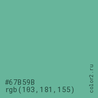 Цвет #67B59B в цветовой модели RGB обозначается тремя октетами (103, 181, 155) в десятичном формате и #67B59B в шестнадцатиричном (hex) формате, которые являются интенсивностью красного 103 (hex 67), интенсивность зелёного 181 (hex B5) и интенсивность синего 155 (hex 9B).