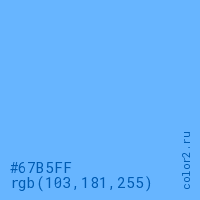 Цвет #67B5FF в цветовой модели RGB обозначается тремя октетами (103, 181, 255) в десятичном формате и #67B5FF в шестнадцатиричном (hex) формате, которые являются интенсивностью красного 103 (hex 67), интенсивность зелёного 181 (hex B5) и интенсивность синего 255 (hex FF).