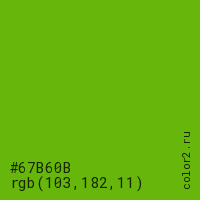 Цвет #67B60B в цветовой модели RGB обозначается тремя октетами (103, 182, 11) в десятичном формате и #67B60B в шестнадцатиричном (hex) формате, которые являются интенсивностью красного 103 (hex 67), интенсивность зелёного 182 (hex B6) и интенсивность синего 11 (hex 0B).