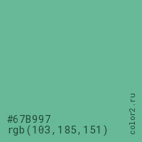 Цвет #67B997 в цветовой модели RGB обозначается тремя октетами (103, 185, 151) в десятичном формате и #67B997 в шестнадцатиричном (hex) формате, которые являются интенсивностью красного 103 (hex 67), интенсивность зелёного 185 (hex B9) и интенсивность синего 151 (hex 97).