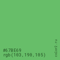 Цвет #67BE69 в цветовой модели RGB обозначается тремя октетами (103, 190, 105) в десятичном формате и #67BE69 в шестнадцатиричном (hex) формате, которые являются интенсивностью красного 103 (hex 67), интенсивность зелёного 190 (hex BE) и интенсивность синего 105 (hex 69).