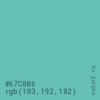 Цвет #67C0B6 в цветовой модели RGB обозначается тремя октетами (103, 192, 182) в десятичном формате и #67C0B6 в шестнадцатиричном (hex) формате, которые являются интенсивностью красного 103 (hex 67), интенсивность зелёного 192 (hex C0) и интенсивность синего 182 (hex B6).