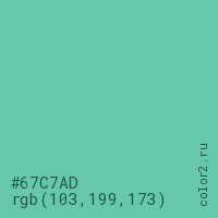 Цвет #67C7AD в цветовой модели RGB обозначается тремя октетами (103, 199, 173) в десятичном формате и #67C7AD в шестнадцатиричном (hex) формате, которые являются интенсивностью красного 103 (hex 67), интенсивность зелёного 199 (hex C7) и интенсивность синего 173 (hex AD).