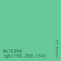 Цвет #67C89A в цветовой модели RGB обозначается тремя октетами (103, 200, 154) в десятичном формате и #67C89A в шестнадцатиричном (hex) формате, которые являются интенсивностью красного 103 (hex 67), интенсивность зелёного 200 (hex C8) и интенсивность синего 154 (hex 9A).