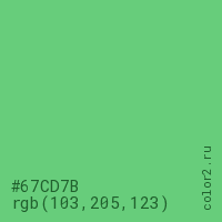 Цвет #67CD7B в цветовой модели RGB обозначается тремя октетами (103, 205, 123) в десятичном формате и #67CD7B в шестнадцатиричном (hex) формате, которые являются интенсивностью красного 103 (hex 67), интенсивность зелёного 205 (hex CD) и интенсивность синего 123 (hex 7B).