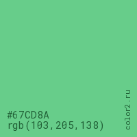 Цвет #67CD8A в цветовой модели RGB обозначается тремя октетами (103, 205, 138) в десятичном формате и #67CD8A в шестнадцатиричном (hex) формате, которые являются интенсивностью красного 103 (hex 67), интенсивность зелёного 205 (hex CD) и интенсивность синего 138 (hex 8A).