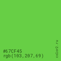 Цвет #67CF45 в цветовой модели RGB обозначается тремя октетами (103, 207, 69) в десятичном формате и #67CF45 в шестнадцатиричном (hex) формате, которые являются интенсивностью красного 103 (hex 67), интенсивность зелёного 207 (hex CF) и интенсивность синего 69 (hex 45).