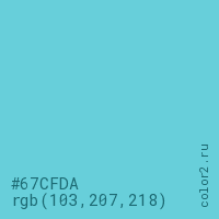Цвет #67CFDA в цветовой модели RGB обозначается тремя октетами (103, 207, 218) в десятичном формате и #67CFDA в шестнадцатиричном (hex) формате, которые являются интенсивностью красного 103 (hex 67), интенсивность зелёного 207 (hex CF) и интенсивность синего 218 (hex DA).