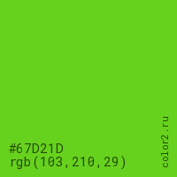 Цвет #67D21D в цветовой модели RGB обозначается тремя октетами (103, 210, 29) в десятичном формате и #67D21D в шестнадцатиричном (hex) формате, которые являются интенсивностью красного 103 (hex 67), интенсивность зелёного 210 (hex D2) и интенсивность синего 29 (hex 1D).