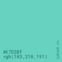 Цвет #67D2BF в цветовой модели RGB обозначается тремя октетами (103, 210, 191) в десятичном формате и #67D2BF в шестнадцатиричном (hex) формате, которые являются интенсивностью красного 103 (hex 67), интенсивность зелёного 210 (hex D2) и интенсивность синего 191 (hex BF).