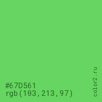 Цвет #67D561 в цветовой модели RGB обозначается тремя октетами (103, 213, 97) в десятичном формате и #67D561 в шестнадцатиричном (hex) формате, которые являются интенсивностью красного 103 (hex 67), интенсивность зелёного 213 (hex D5) и интенсивность синего 97 (hex 61).