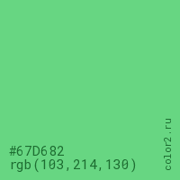 Цвет #67D682 в цветовой модели RGB обозначается тремя октетами (103, 214, 130) в десятичном формате и #67D682 в шестнадцатиричном (hex) формате, которые являются интенсивностью красного 103 (hex 67), интенсивность зелёного 214 (hex D6) и интенсивность синего 130 (hex 82).