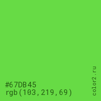 Цвет #67DB45 в цветовой модели RGB обозначается тремя октетами (103, 219, 69) в десятичном формате и #67DB45 в шестнадцатиричном (hex) формате, которые являются интенсивностью красного 103 (hex 67), интенсивность зелёного 219 (hex DB) и интенсивность синего 69 (hex 45).