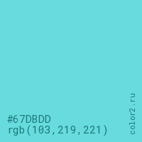 Цвет #67DBDD в цветовой модели RGB обозначается тремя октетами (103, 219, 221) в десятичном формате и #67DBDD в шестнадцатиричном (hex) формате, которые являются интенсивностью красного 103 (hex 67), интенсивность зелёного 219 (hex DB) и интенсивность синего 221 (hex DD).