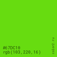 Цвет #67DC10 в цветовой модели RGB обозначается тремя октетами (103, 220, 16) в десятичном формате и #67DC10 в шестнадцатиричном (hex) формате, которые являются интенсивностью красного 103 (hex 67), интенсивность зелёного 220 (hex DC) и интенсивность синего 16 (hex 10).
