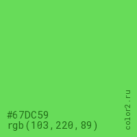 Цвет #67DC59 в цветовой модели RGB обозначается тремя октетами (103, 220, 89) в десятичном формате и #67DC59 в шестнадцатиричном (hex) формате, которые являются интенсивностью красного 103 (hex 67), интенсивность зелёного 220 (hex DC) и интенсивность синего 89 (hex 59).