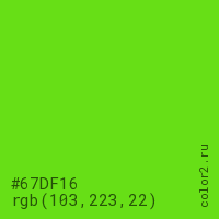 Цвет #67DF16 в цветовой модели RGB обозначается тремя октетами (103, 223, 22) в десятичном формате и #67DF16 в шестнадцатиричном (hex) формате, которые являются интенсивностью красного 103 (hex 67), интенсивность зелёного 223 (hex DF) и интенсивность синего 22 (hex 16).