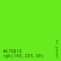 Цвет #67EB1E в цветовой модели RGB обозначается тремя октетами (103, 235, 30) в десятичном формате и #67EB1E в шестнадцатиричном (hex) формате, которые являются интенсивностью красного 103 (hex 67), интенсивность зелёного 235 (hex EB) и интенсивность синего 30 (hex 1E).