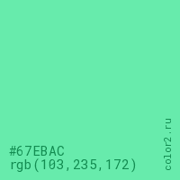 Цвет #67EBAC в цветовой модели RGB обозначается тремя октетами (103, 235, 172) в десятичном формате и #67EBAC в шестнадцатиричном (hex) формате, которые являются интенсивностью красного 103 (hex 67), интенсивность зелёного 235 (hex EB) и интенсивность синего 172 (hex AC).