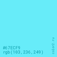 Цвет #67ECF9 в цветовой модели RGB обозначается тремя октетами (103, 236, 249) в десятичном формате и #67ECF9 в шестнадцатиричном (hex) формате, которые являются интенсивностью красного 103 (hex 67), интенсивность зелёного 236 (hex EC) и интенсивность синего 249 (hex F9).