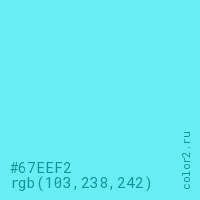 Цвет #67EEF2 в цветовой модели RGB обозначается тремя октетами (103, 238, 242) в десятичном формате и #67EEF2 в шестнадцатиричном (hex) формате, которые являются интенсивностью красного 103 (hex 67), интенсивность зелёного 238 (hex EE) и интенсивность синего 242 (hex F2).