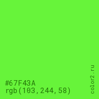 Цвет #67F43A в цветовой модели RGB обозначается тремя октетами (103, 244, 58) в десятичном формате и #67F43A в шестнадцатиричном (hex) формате, которые являются интенсивностью красного 103 (hex 67), интенсивность зелёного 244 (hex F4) и интенсивность синего 58 (hex 3A).