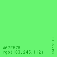 Цвет #67F570 в цветовой модели RGB обозначается тремя октетами (103, 245, 112) в десятичном формате и #67F570 в шестнадцатиричном (hex) формате, которые являются интенсивностью красного 103 (hex 67), интенсивность зелёного 245 (hex F5) и интенсивность синего 112 (hex 70).