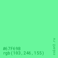 Цвет #67F69B в цветовой модели RGB обозначается тремя октетами (103, 246, 155) в десятичном формате и #67F69B в шестнадцатиричном (hex) формате, которые являются интенсивностью красного 103 (hex 67), интенсивность зелёного 246 (hex F6) и интенсивность синего 155 (hex 9B).