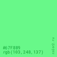 Цвет #67F889 в цветовой модели RGB обозначается тремя октетами (103, 248, 137) в десятичном формате и #67F889 в шестнадцатиричном (hex) формате, которые являются интенсивностью красного 103 (hex 67), интенсивность зелёного 248 (hex F8) и интенсивность синего 137 (hex 89).