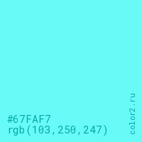 Цвет #67FAF7 в цветовой модели RGB обозначается тремя октетами (103, 250, 247) в десятичном формате и #67FAF7 в шестнадцатиричном (hex) формате, которые являются интенсивностью красного 103 (hex 67), интенсивность зелёного 250 (hex FA) и интенсивность синего 247 (hex F7).