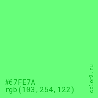 Цвет #67FE7A в цветовой модели RGB обозначается тремя октетами (103, 254, 122) в десятичном формате и #67FE7A в шестнадцатиричном (hex) формате, которые являются интенсивностью красного 103 (hex 67), интенсивность зелёного 254 (hex FE) и интенсивность синего 122 (hex 7A).