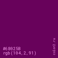 Цвет #68025B в цветовой модели RGB обозначается тремя октетами (104, 2, 91) в десятичном формате и #68025B в шестнадцатиричном (hex) формате, которые являются интенсивностью красного 104 (hex 68), интенсивность зелёного 2 (hex 02) и интенсивность синего 91 (hex 5B).